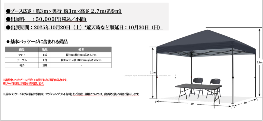 – ブース仕様:テント1張(横3m×奥行3m程度を予定)、テーブル1台・椅子2脚を標準セットとして提供